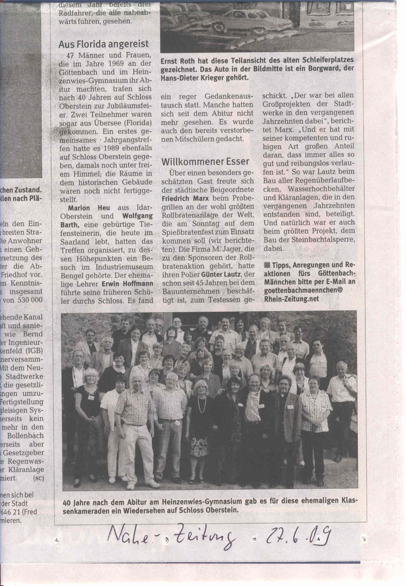 Das Gruppenfoto auf der Schlosstreppe (hochauflösend wenn man draufklickt) dient auch als Aufdruck der Sammel-CD mit Bildern des Abitreffs. Darauf sind alle elektronischen Fotos und Videos, die mich bis Mitte Juli 2009 erreicht haben.Die CD ist fertig und wurde Anfang August 2009 an alle verschickt, von denen mir eine aktuelle Versandadresse vorliegt sowie auch an ein paar Lehrer. Dieses Bild als Ergänzung zu einem Artikel, der auch Marion Heu und mich als Tiefensteinerin (sic!) erwähnt, fand sich auch in der Nahe-Zeitung.